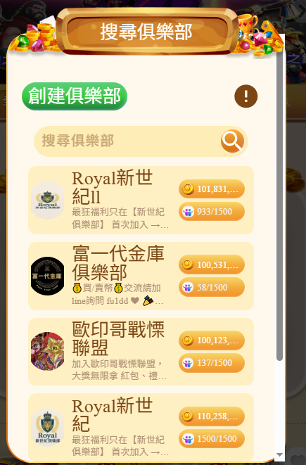 像是「Royal新世紀」、「富一代金庫俱樂部」與「歐印軍戰幫聯盟」等俱樂部,都有活躍的玩家群與高額獎勵制度。